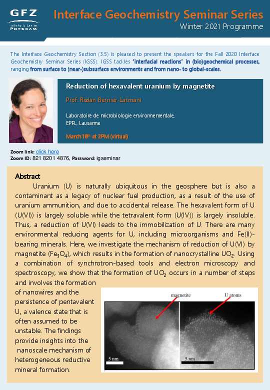 Interface Geochemistry Seminar: Prof. Rizlan Bernier-Latmani on: “Reduction of hexavalent uranium by magnetite”